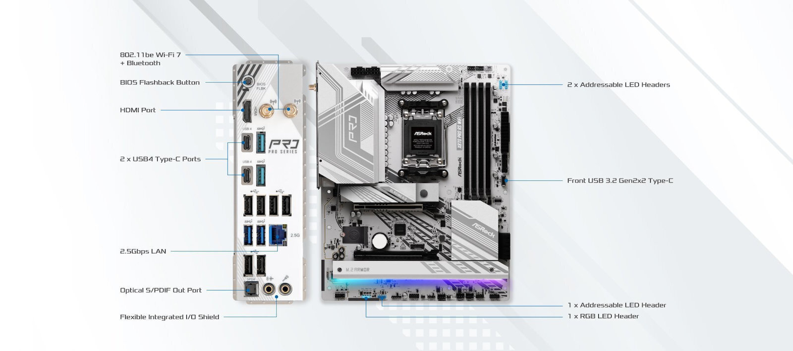 Αυτή η μητρική πλακέτα διαθέτει ενσωματωμένες κεφαλίδες RGB και διευθυνσιοδοτούμενες κεφαλίδες RGB που επιτρέπουν τη σύνδεση της μητρικής πλακέτας με συμβατές συσκευές LED όπως λωρίδα, ανεμιστήρες CPU, ψύκτες, σασί και ούτω καθεξής. Οι χρήστες μπορούν επίσης να συγχρονίσουν συσκευές RGB LED στα αξεσουάρ με πιστοποίηση Polychrome RGB Sync για να δημιουργήσουν τα δικά τους μοναδικά εφέ φωτισμού.