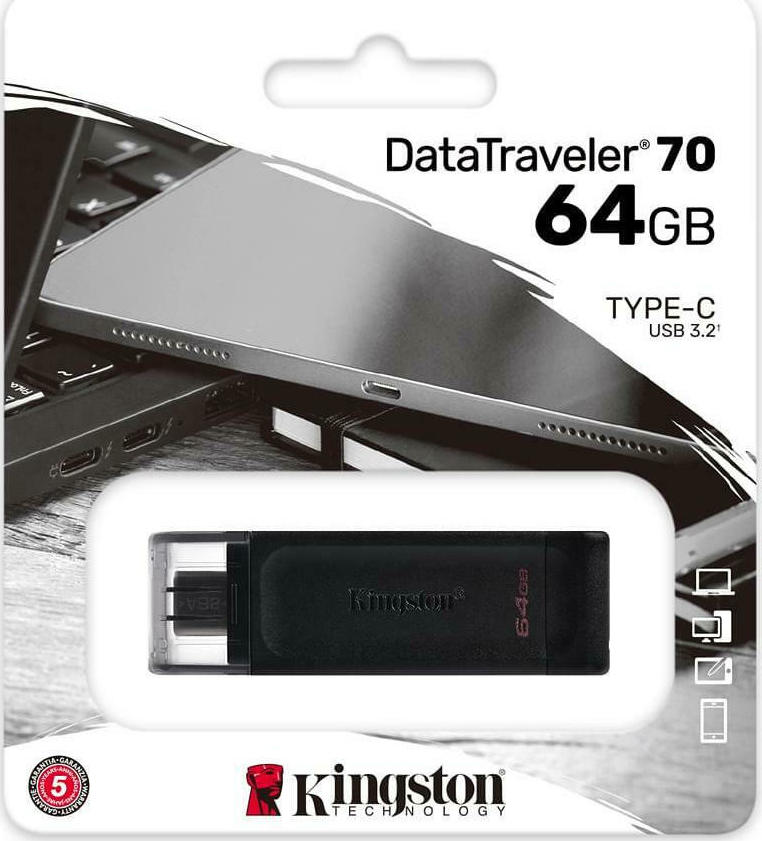 Σχεδιασμένο για χρήση με συμβατές συσκευές USB-C, όπως φορητούς υπολογιστές, tablet και τηλέφωνα. Με χωρητικότητα έως και 128 GB, το DataTraveler 70 είναι ικανό να επεκτείνει τον χώρο αποθήκευσης.